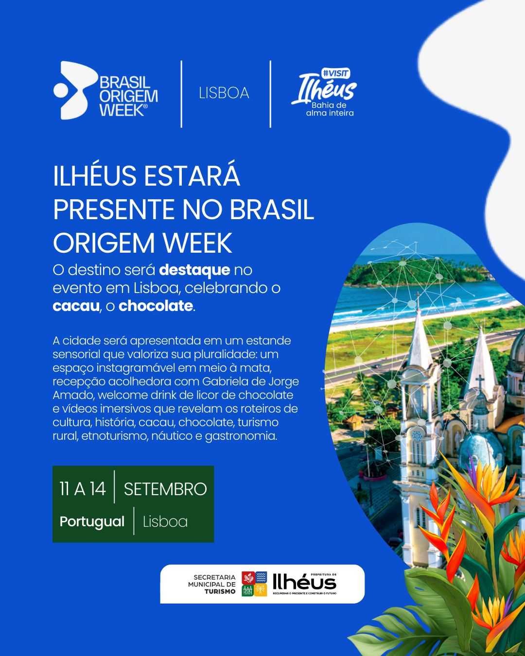 A Prefeitura de Ilhéus, por meio da Secretaria de Turismo (Setur), intensifica a promoção do município como destino turístico nos mercados regional, nacional e internacional. Entre os dias 11 e 14 de setembro de 2025, Ilhéus participará da Brasil Origem Week, em Lisboa (Portugal), apresentando seu potencial turístico, cultural e histórico, e reconhecimento de Capital Mundial do Cacau e do Chocolate.